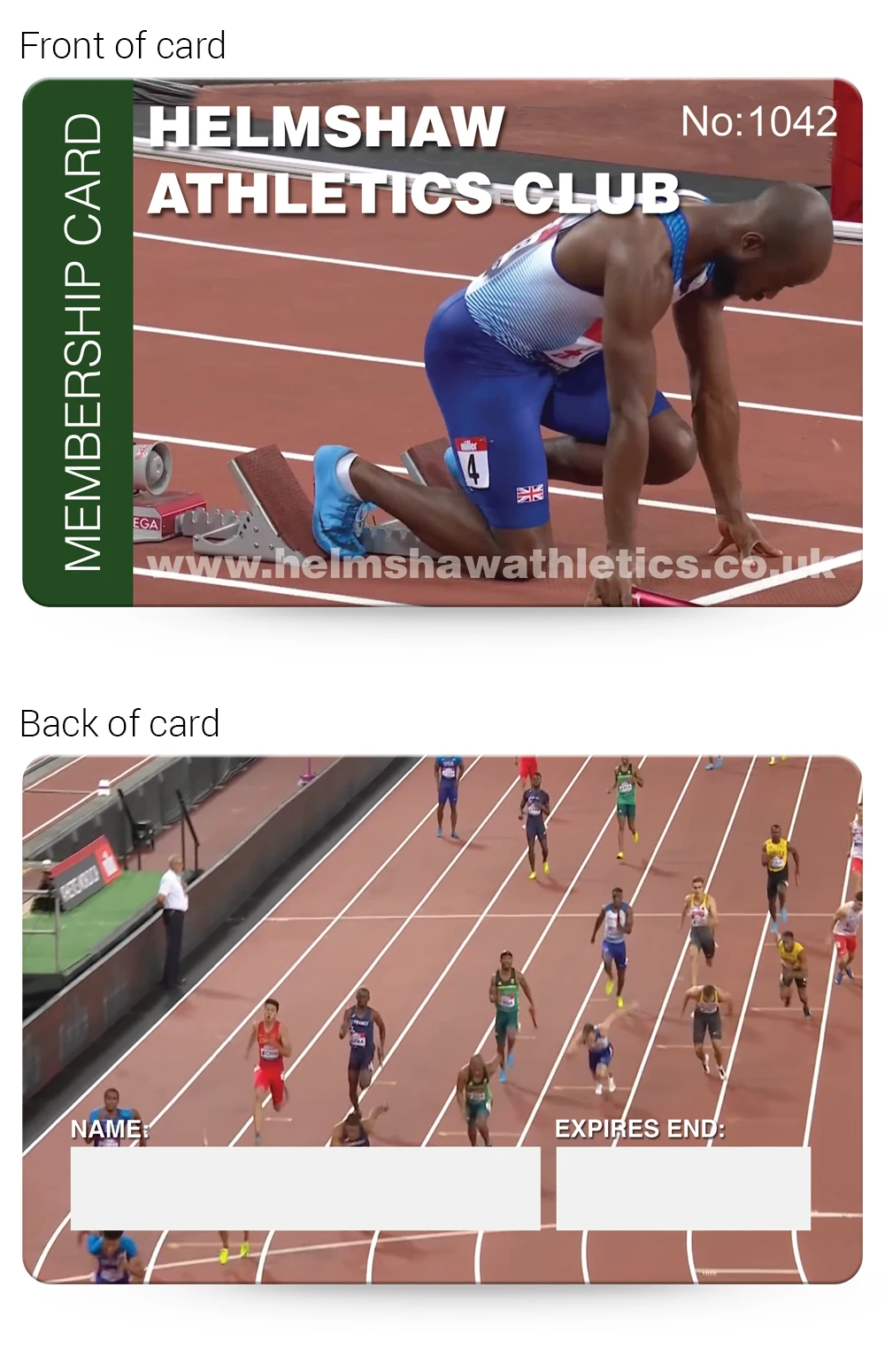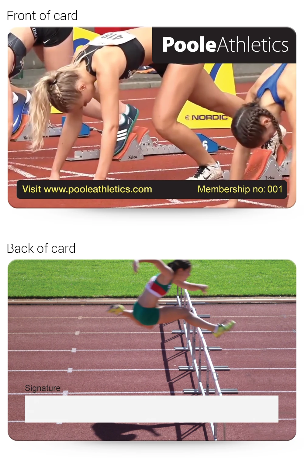 We have lots of Athletics Club Membership Card examples that you are welcome to base your design on, complete with your logo and any photographs that you supply, just email them over for no extra cost!