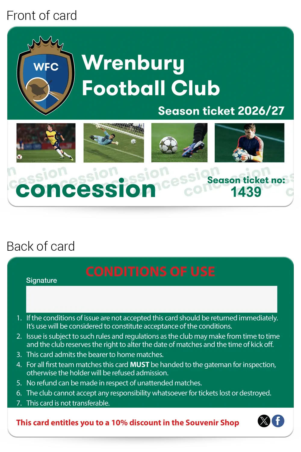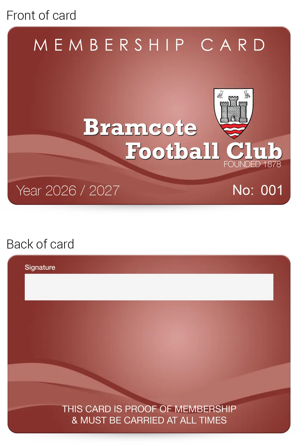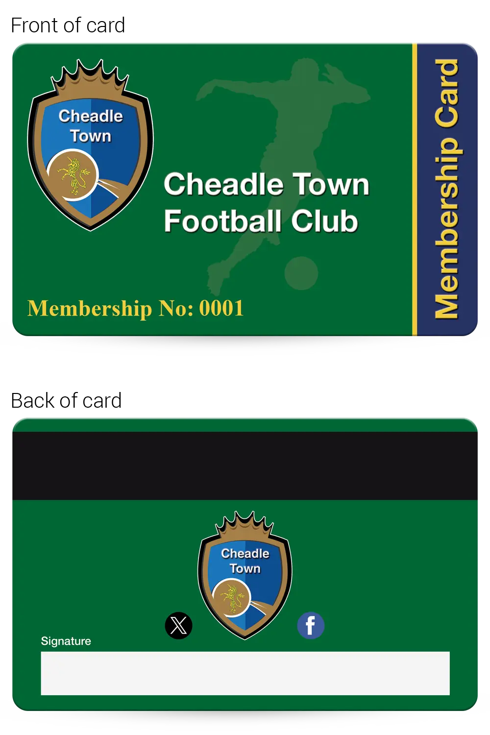 This realistic mock-up shows how your finished Football Club membership cards will look, so you can check and approve the layout, text and overall design before production begins.