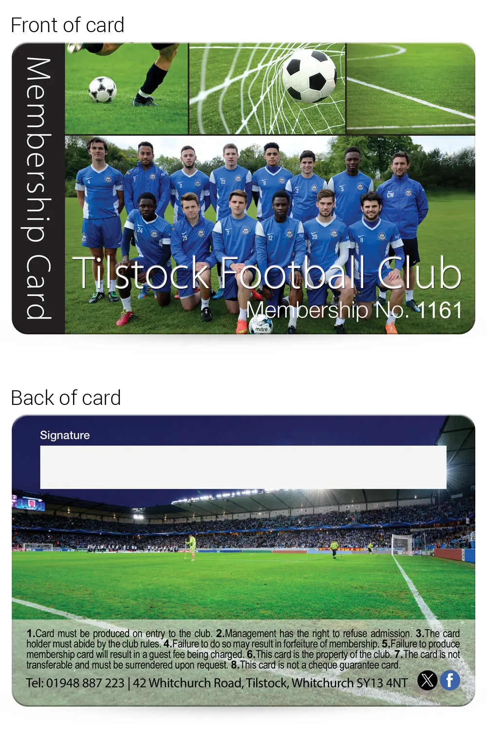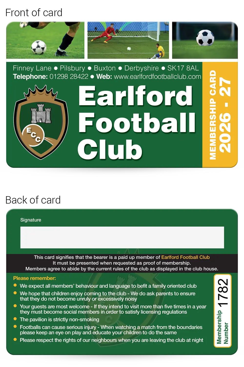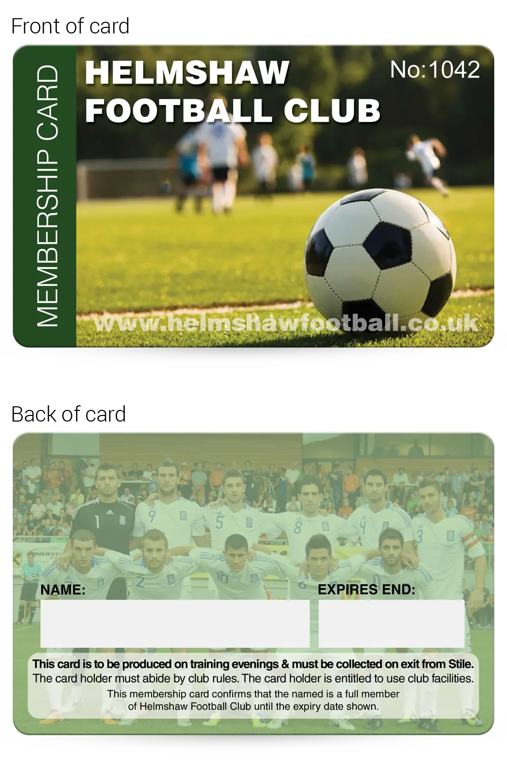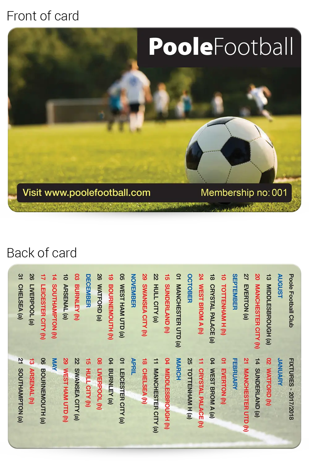 We have lots of Football Club Membership Card examples that you are welcome to base your design on, complete with your logo and any photographs that you supply, just email them over for no extra cost!
