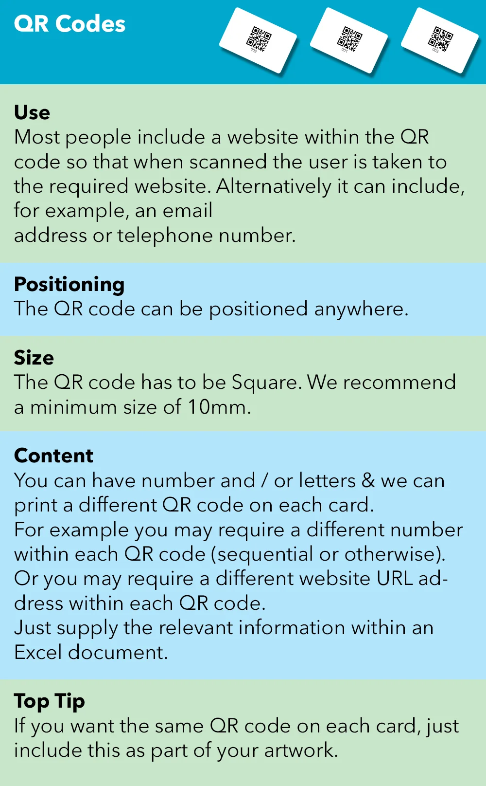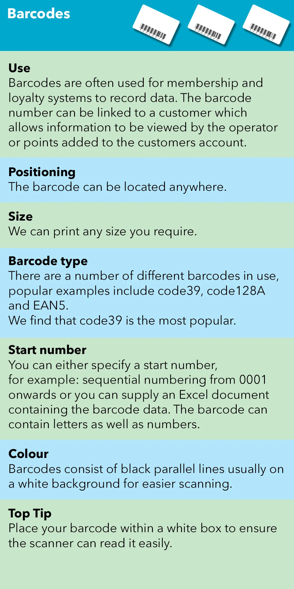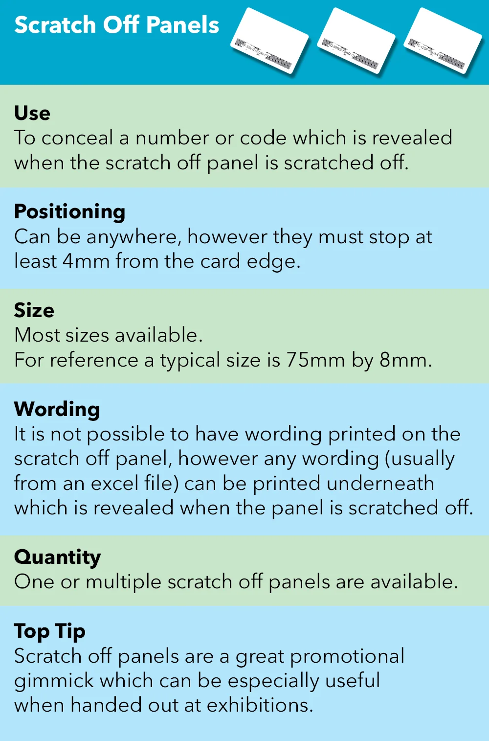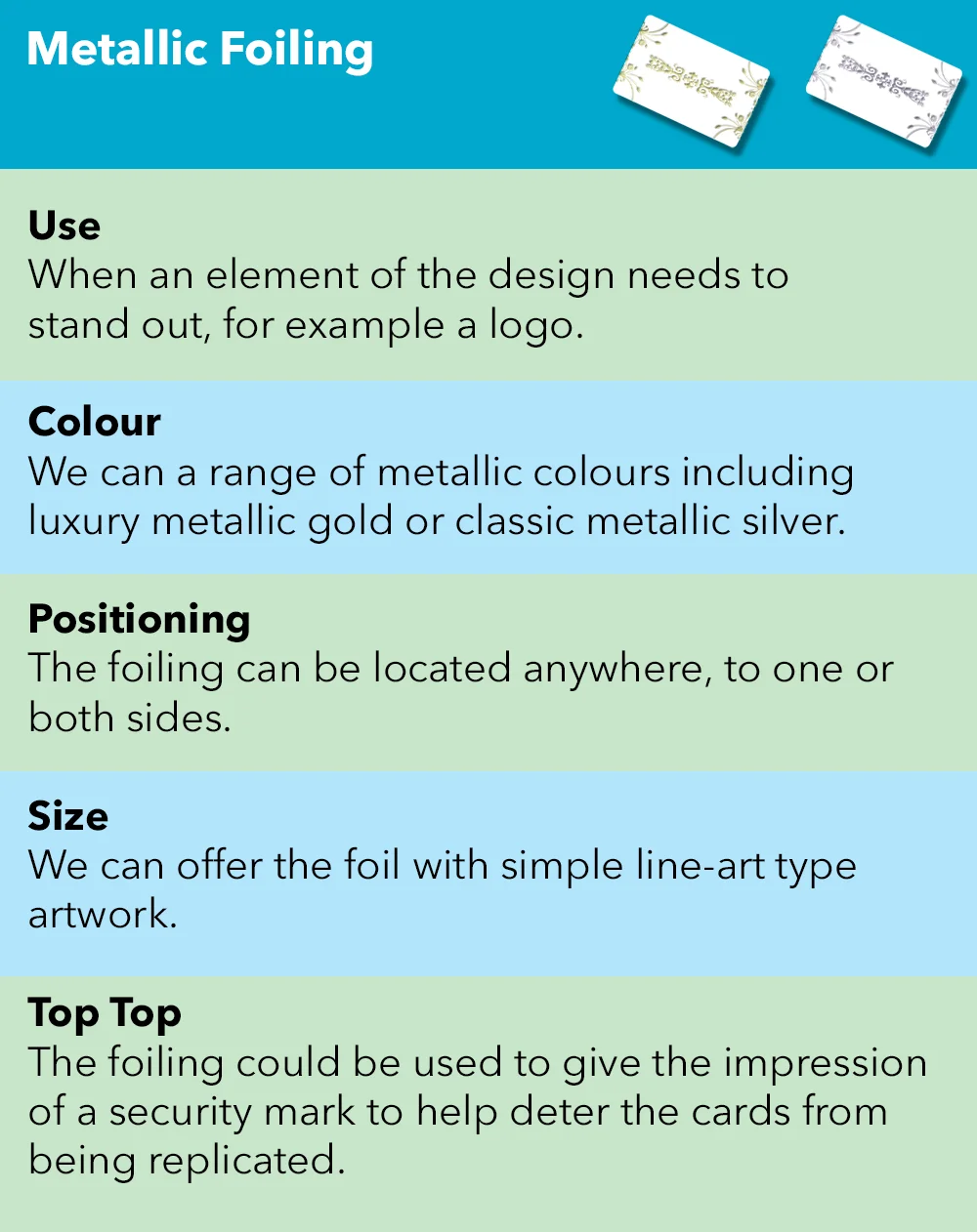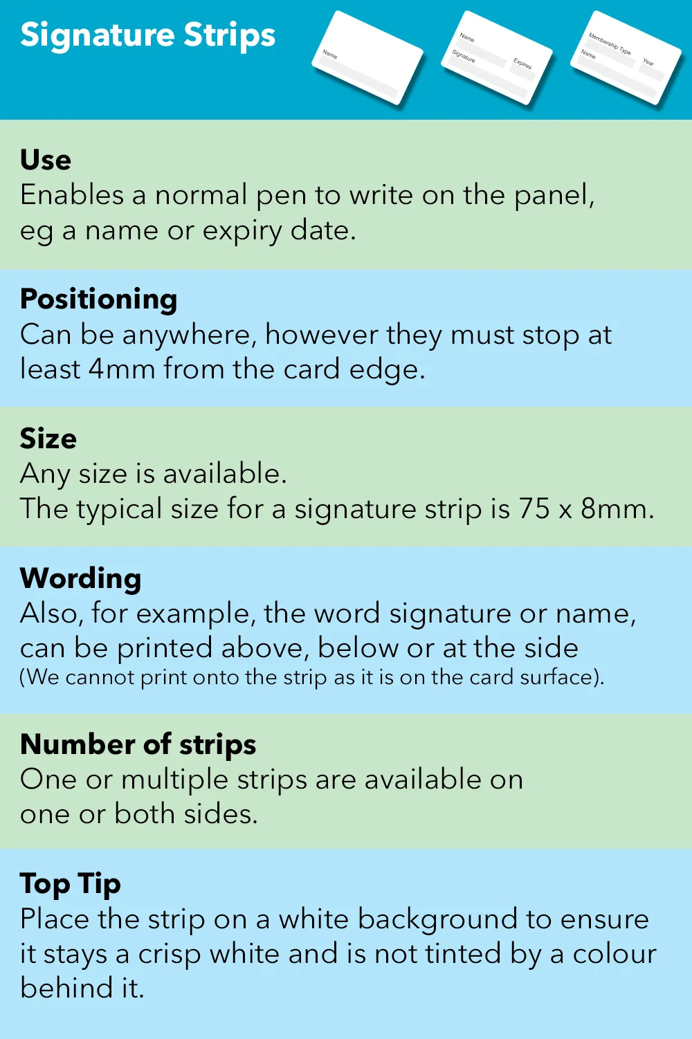 These include signature panels for personalisation or verification, barcodes and QR codes for easy scanning and tracking, magnetic strips for use with swipe card systems and embossed numbering or personalisation to give your cards a raised, professional feel, just like a traditional credit card.
