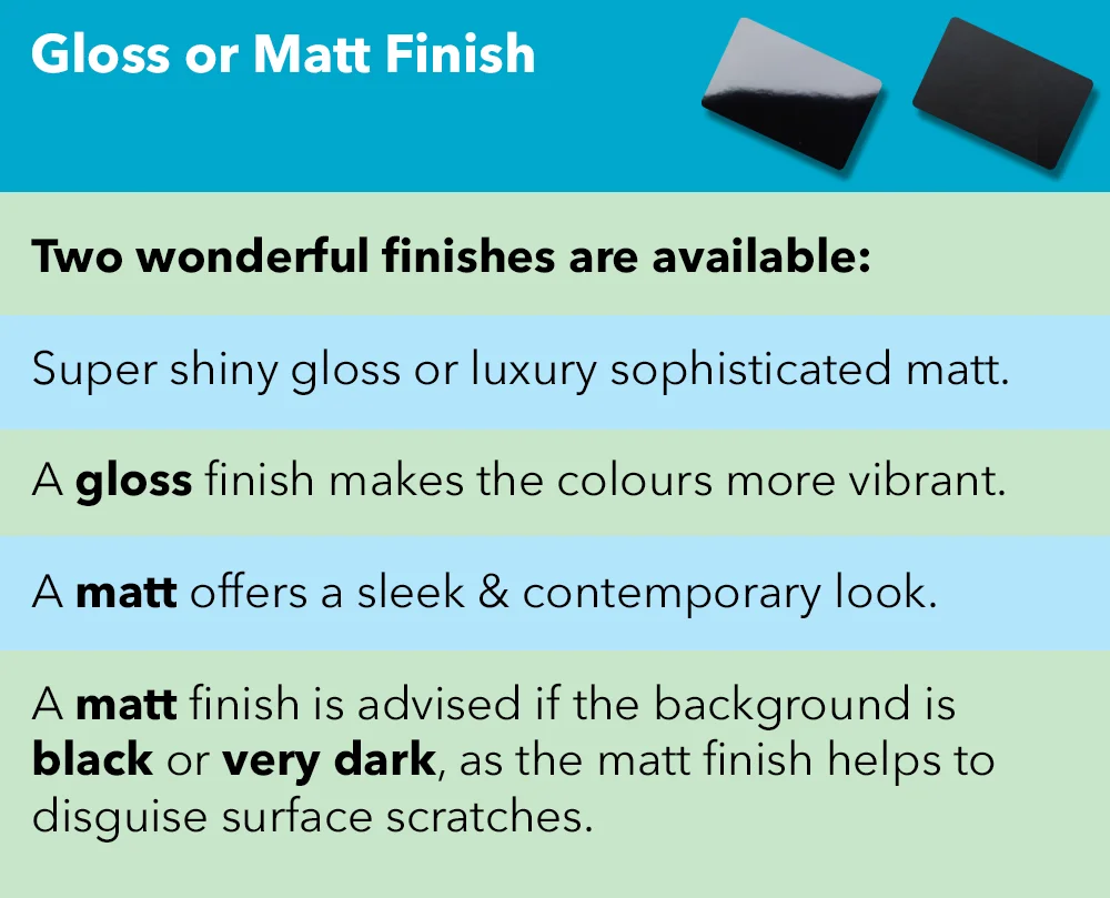 You can choose between a sleek high gloss finish for extra shine or a premium premium matt for a smooth, elegant feel.