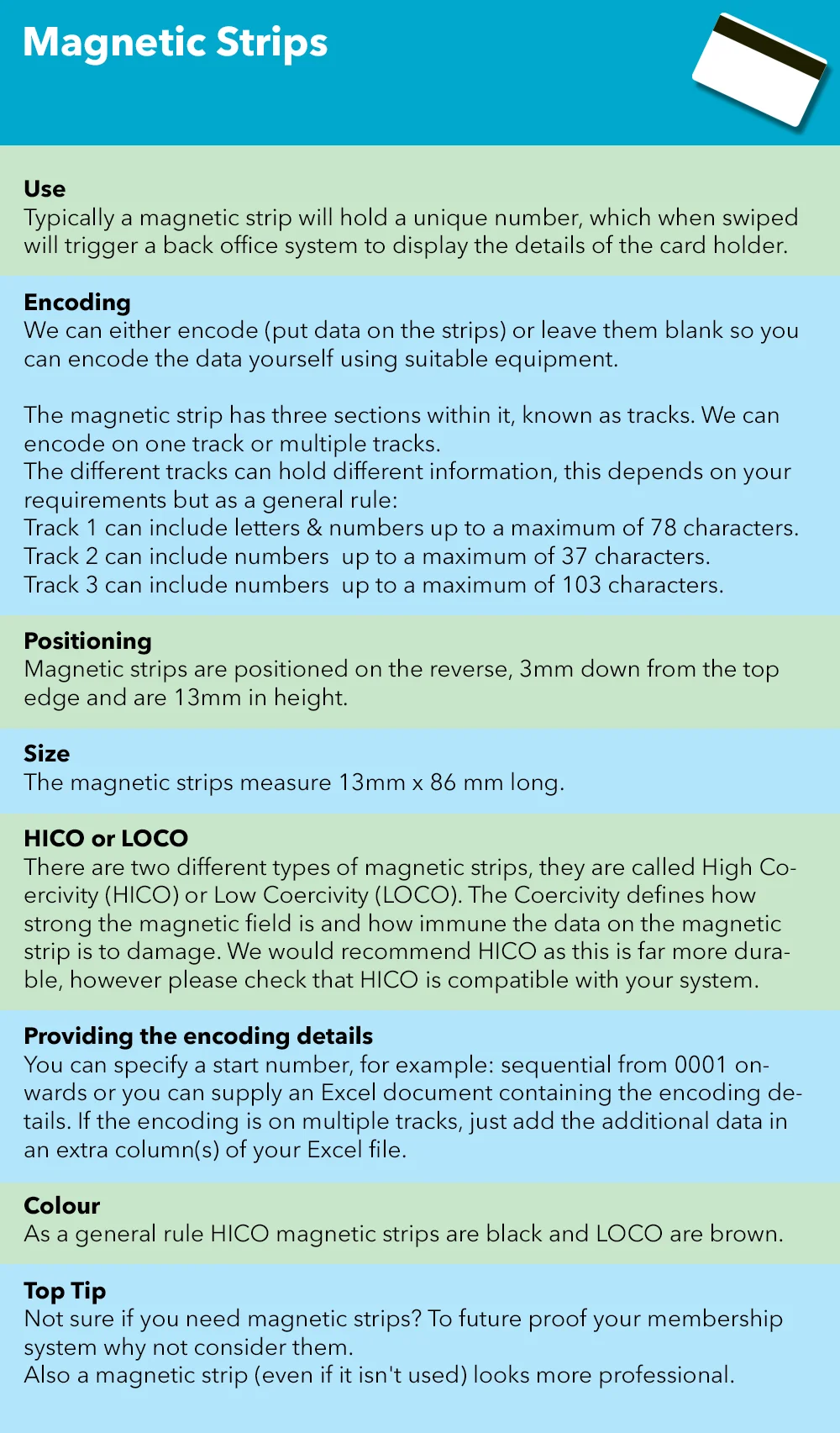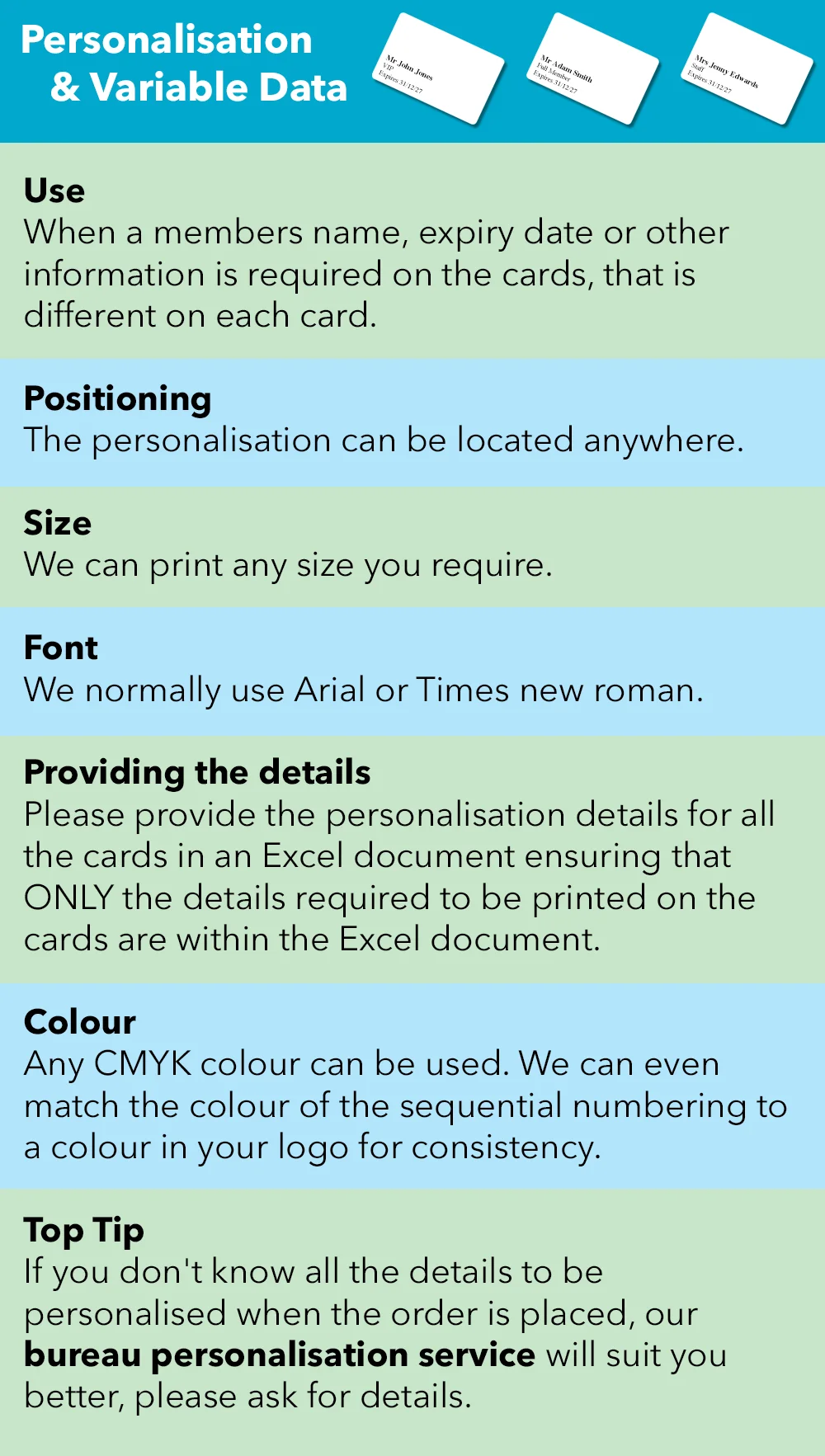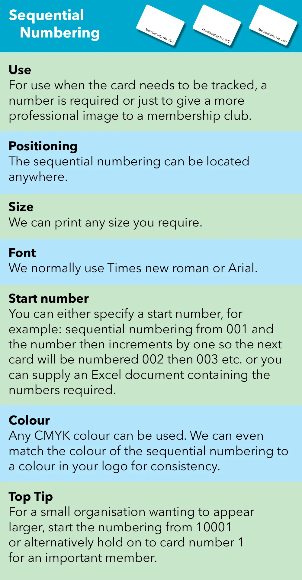 The majority of cards that we print have a signature strip and also a unique number which is usually sequential however you can supply an Excel document and we can print the details from the document onto the cards so each one has unique details. For example, their name, membership number, expiry date, level of membership etc.
