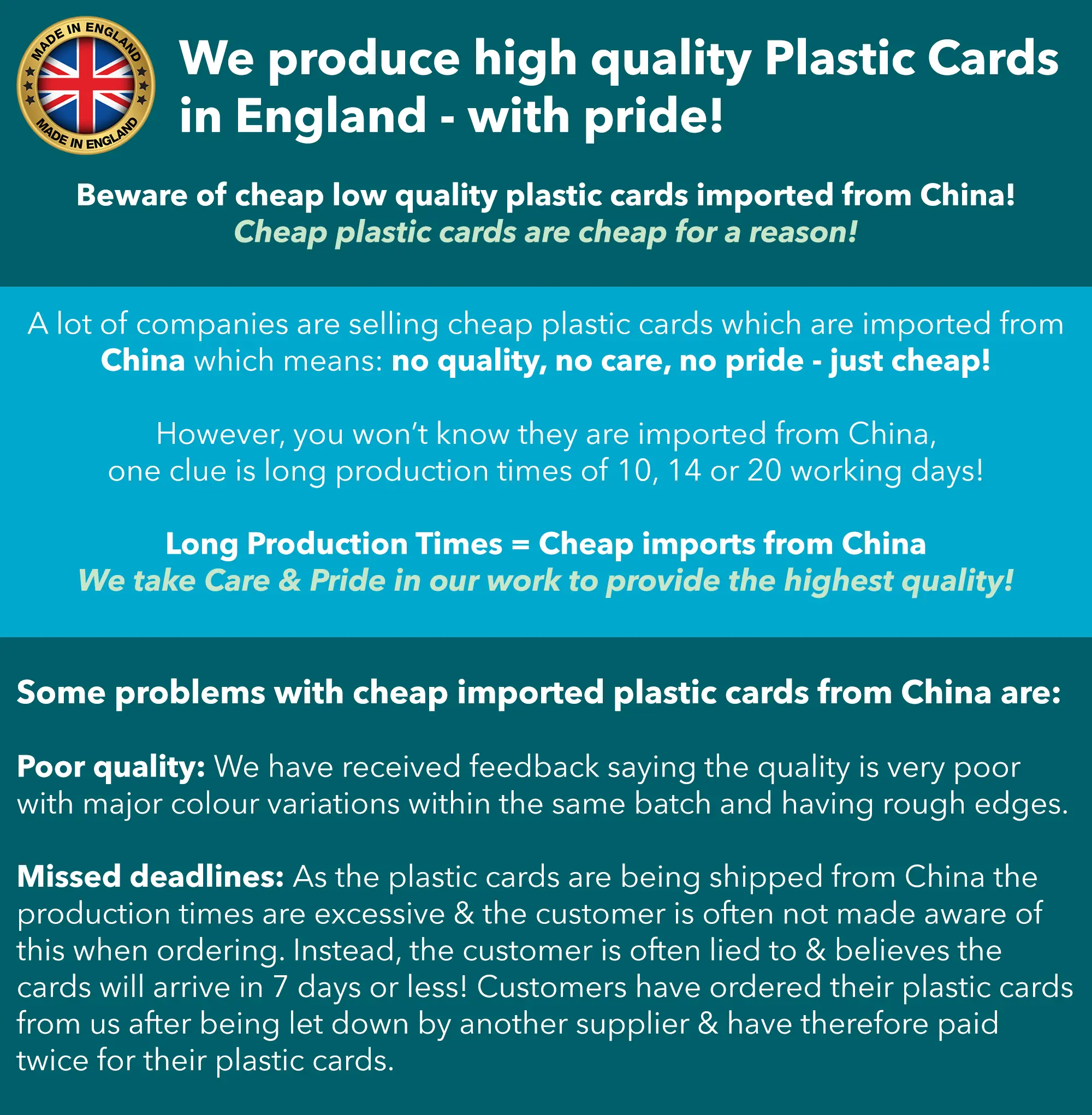 Our translucent plastic cards are proudly manufactured in England to the highest quality standards, ensuring durability, sharp print detail, and a premium finish every time.