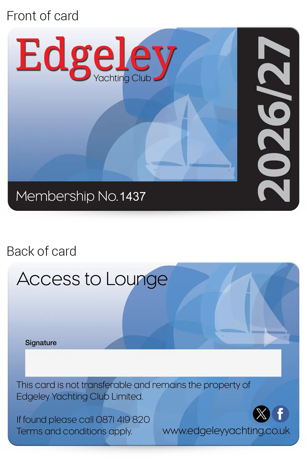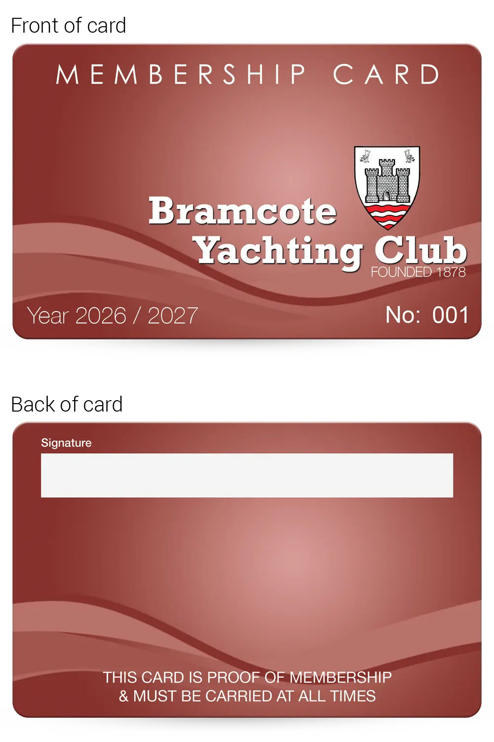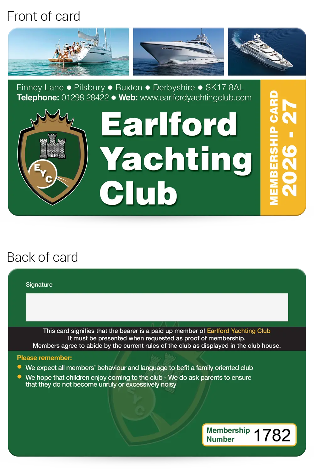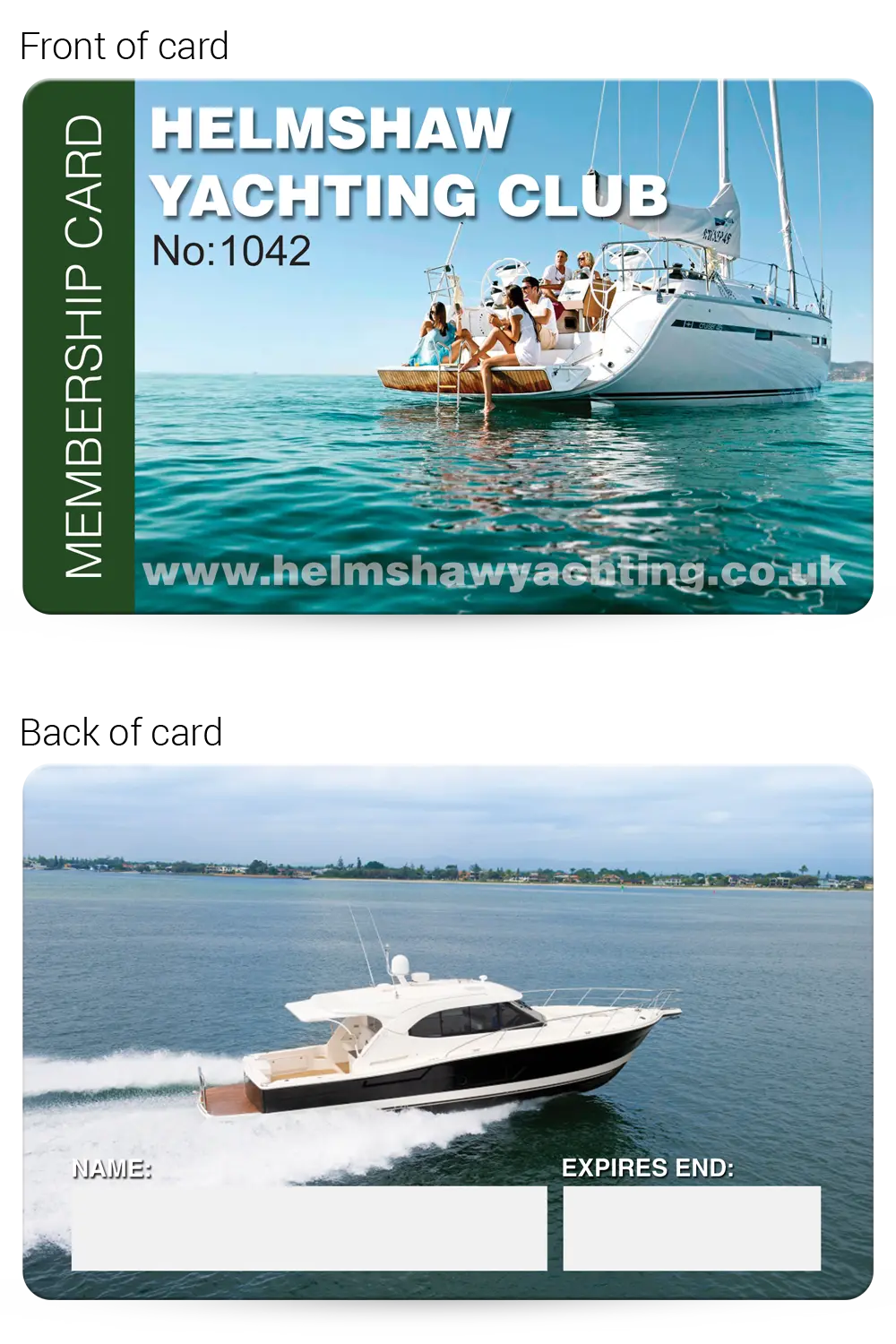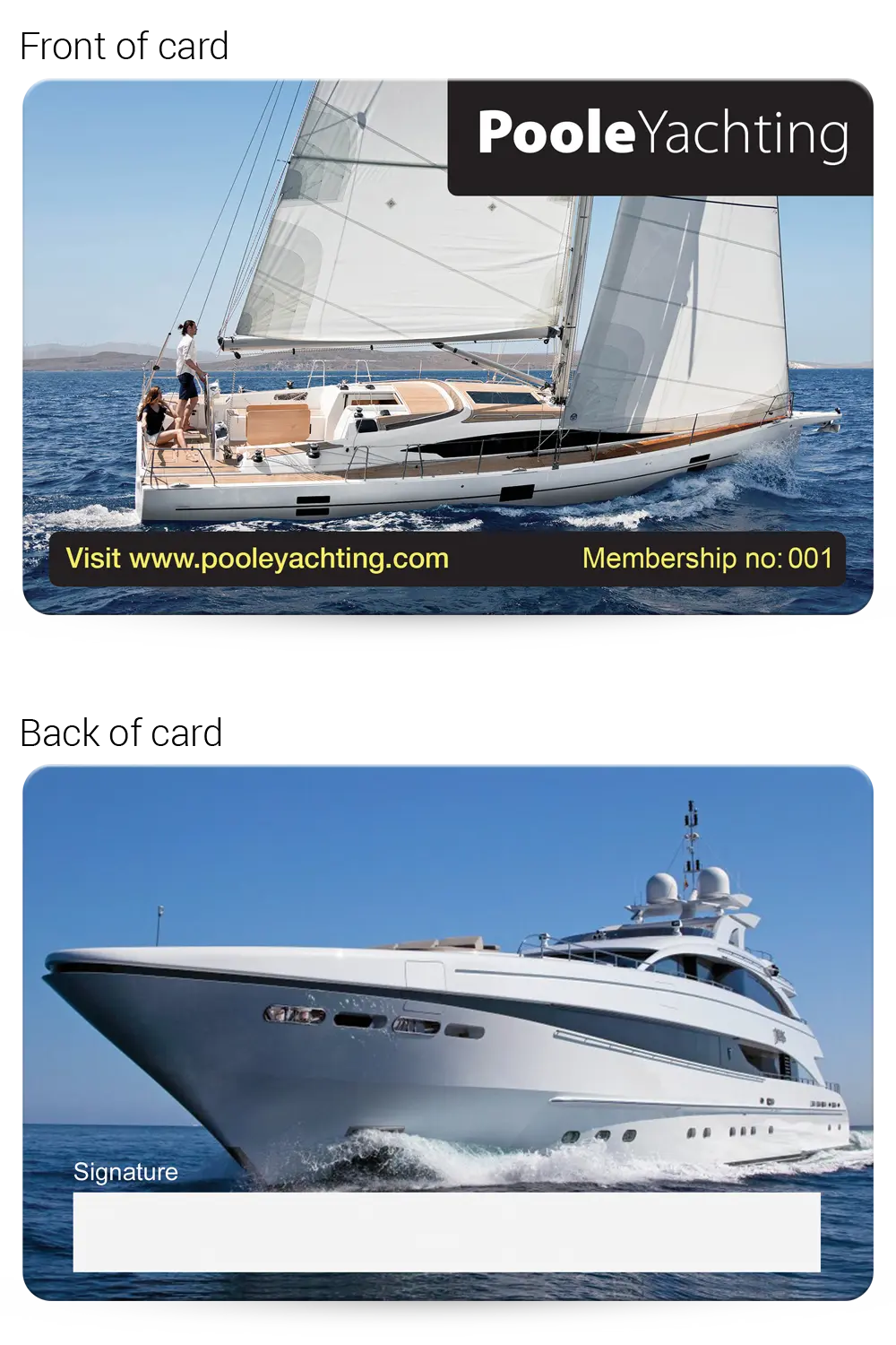 This realistic mock-up shows how your finished Yachting Club membership cards will look, so you can check and approve the layout, text and overall design before production begins.